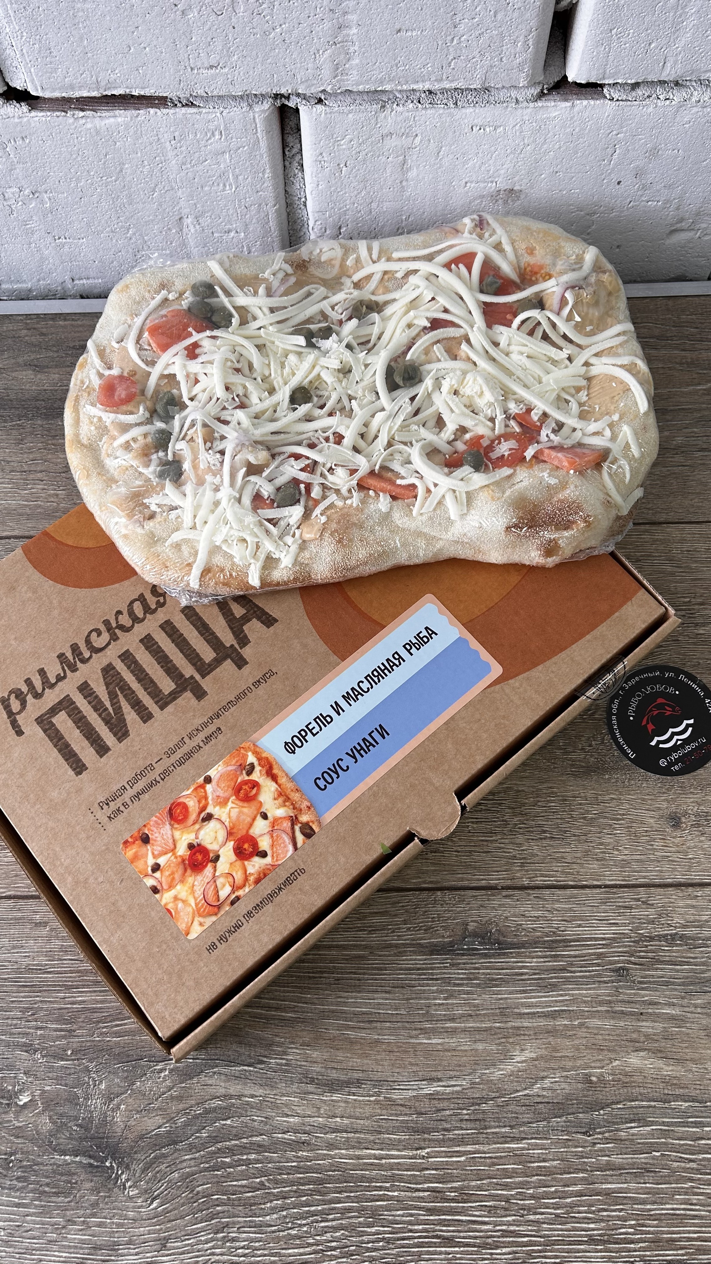Корж для пиццы (мука пшеничная высший сорт, вода питьевая, мука рисовая, мука из бобовых, дрожжи х/п инстантные (дрожжи, эмульгатор, антиокислитель; аскорбиновая кислота), крупа манная, масло подсолнечное, соль пищевая, сахар), сыр моцарелла м.д.ж в сухом веществе 40% (пастеризованное молоко, соль пищевая, термофильная бактериальная закваска, молокосвертывающий ферментный препарат микробиального происхождения), соус унаги (унаги (соевый соус (вода питьевая, соевые бобы, пшеница, соль пищевая), питьевая вода, сахар, натуральные пряности и их экстракты, овощи сушеные (чеснок, лук, сельдерей, томат, имбирь, паприка), мед натуральный, уксус винный, карамелизированный сахарный сироп, ароматизаторы, гидролизат растительного белка (кукурузы)), масло подсолнечное рафинированное дезодорированное, сливки питьевые 20%, сыр крем чиз м.д.ж. в сухом веществе 70% (сливки нормализованные пастеризованные, соль пищевая, мезофильные бактериальные закваски)), форель радужная, масляная рыба, помидоры черри, лук красный, каперсы (каперсы, уксус пищевой 9%, вода питьевая, соль пищевая).