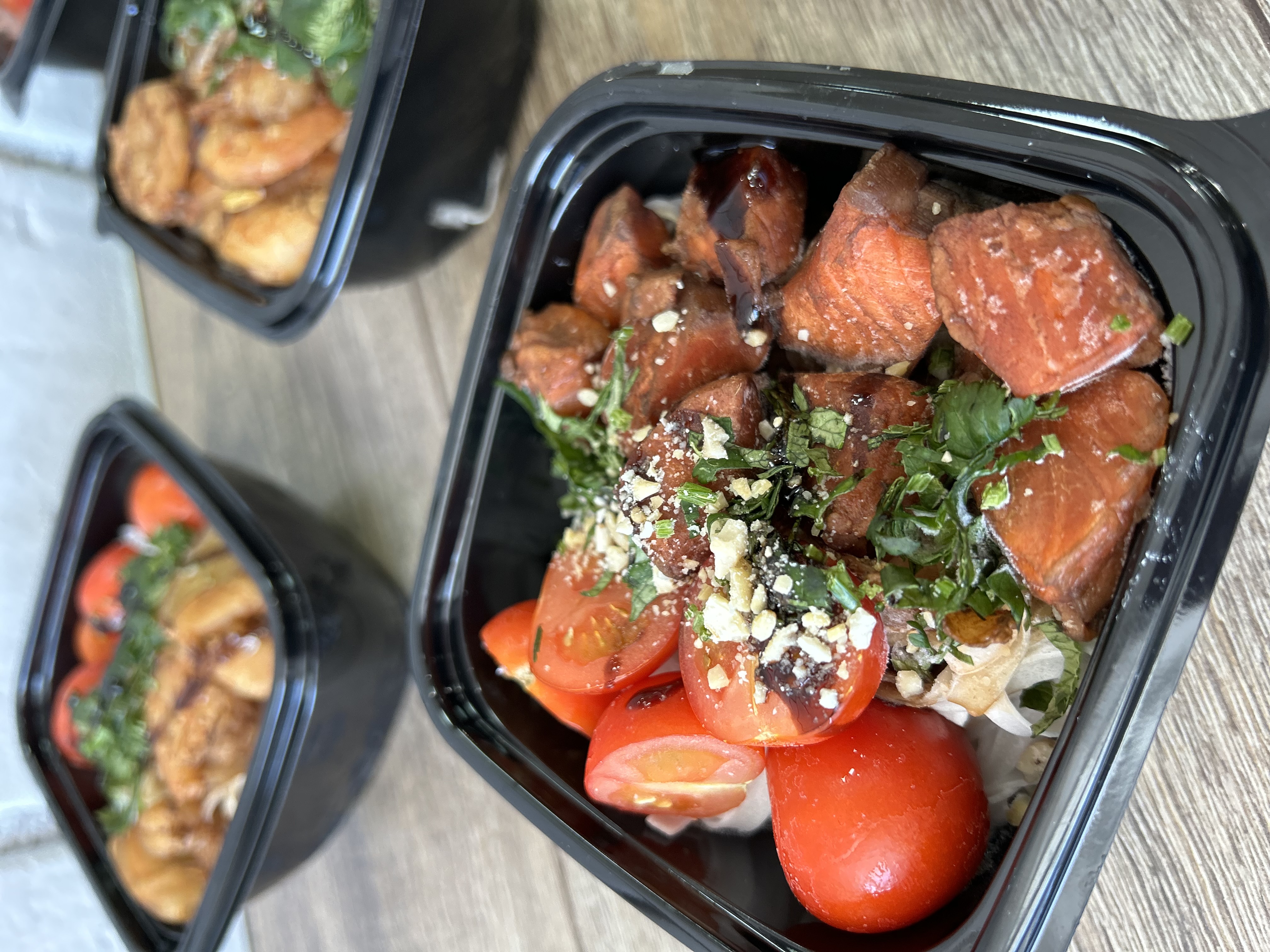 Состав: Рисовая лапша, филе лосося, томаты черри, кинза, имбирь, авторский соус.
